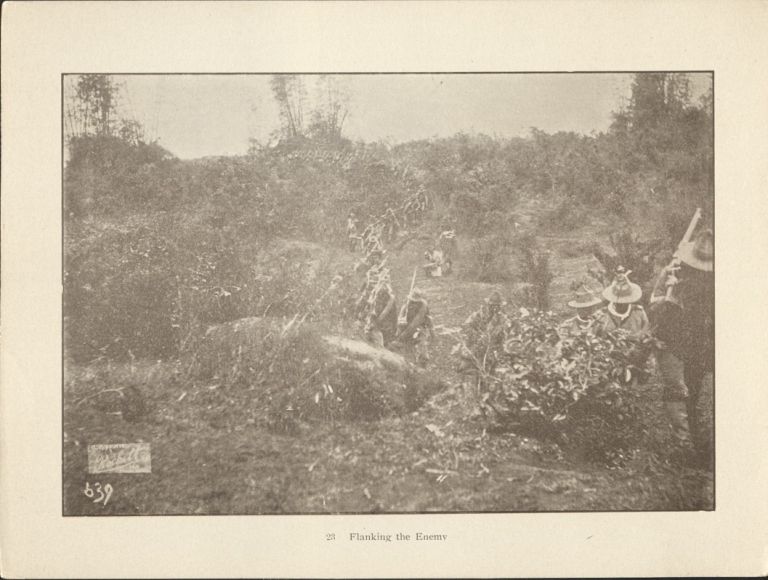 Subject: U.S. soliders march in a line through brushy country to reposition themselves during the Philippine-American War. Givens was the post photographer at the Presidio of San Francisco
