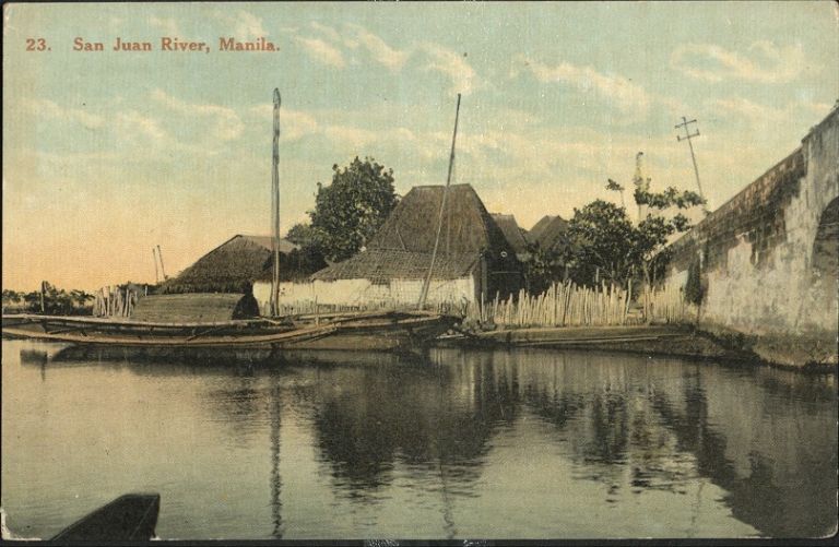 Subject: San Juan River in Quezon City (a tributary of Pasig River) with bridge, boat docked beside hut.