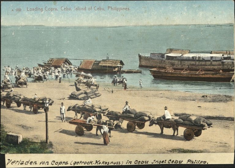 Subject: Line of carabao-driven carts in Cebu carrying sacks of copra (dried coconut meat) to men loading barges.