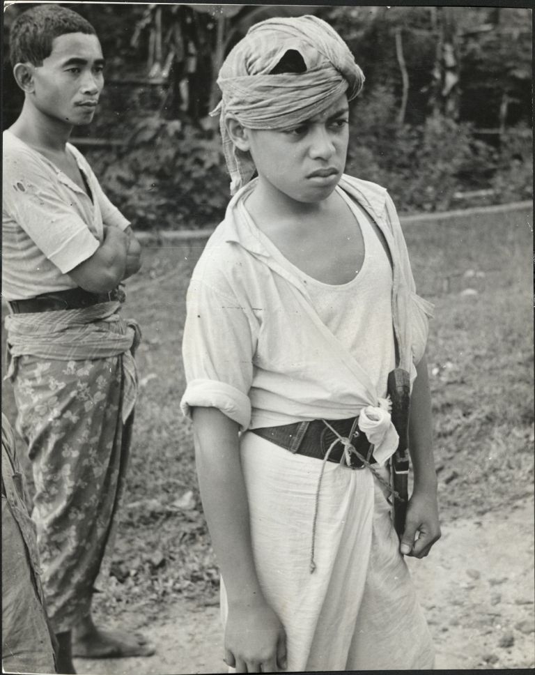 Subject: Two Filipino mean carrying large knives stand beside a road. Judging by their dress, these men are likely in Mindanao or the Sulu Archipelago.