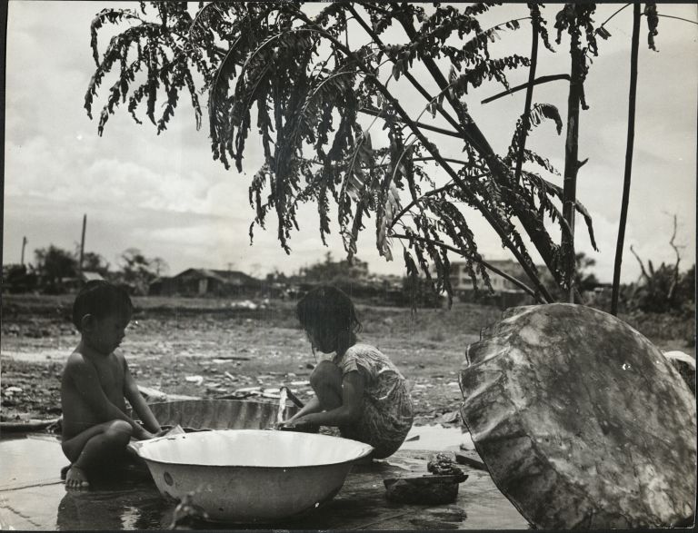 Subject: A boy and a girl, brother and sister, wash clothes in wash basins (called "batyas") by a vacant lot in Manila. See OFI-001482 for same scene shot from a different angle.