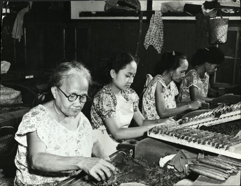 Subject: Filipino women sit at table rolling tobacco leaves into cigars.