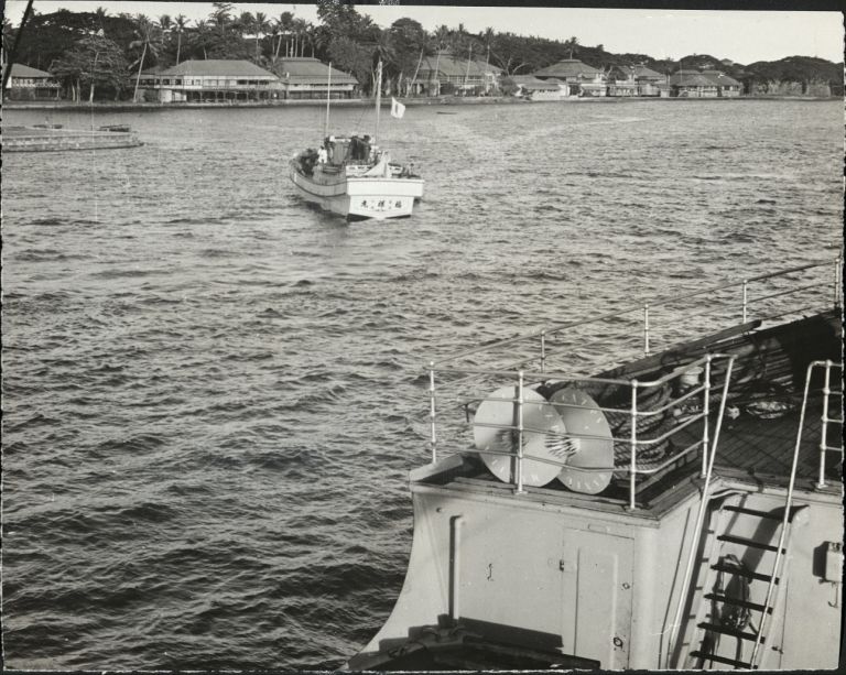 Subject: A launch flying the Japanese flag approaches the (coast guard?) vessel "Legazpi" in Manila Bay.