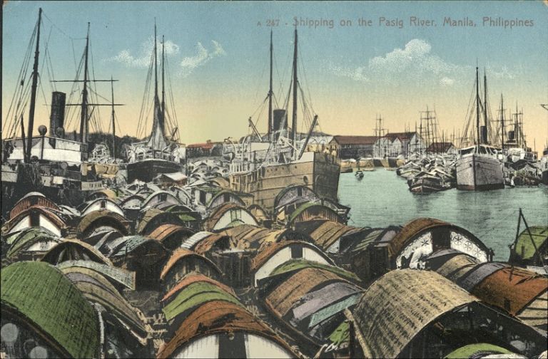 Subject: Cascos (freight boats) and small steamers at anchor along Pasig River in Manila.