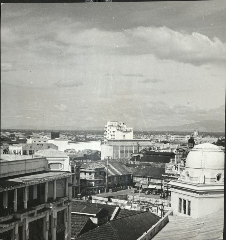Subject: View likely from Santa Cruz looking east toward Quiapo and Sampaloc in Manila. Main building of University of Santo Tomas visible on left above dome.