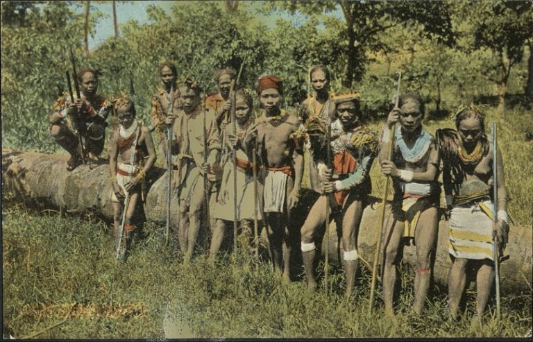 Subject: Indigenous men and women (likely Igorots) pose on a big log in clearing, holding spears.