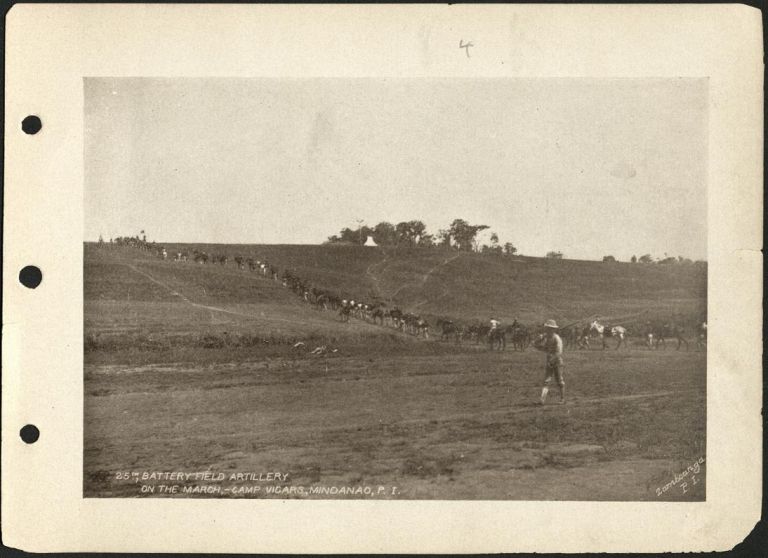 Subject: U.S. soldiers and horse-drawn artillery on maneuvers in a field in the Mindanao plains. Attribution is in question as this includes the markings of Piang Studio in Zamboanga (the