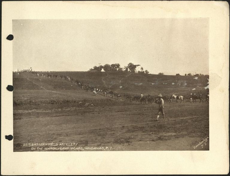 Subject: U.S. soldiers and horse-drawn artillery on maneuvers in a field in the Mindanao plains. Attribution is in question as this includes the markings of Piang Studio in Zamboanga (the