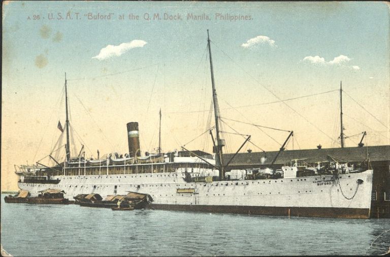 Subject: U.S. Army transport vessel (troop ship) �Buford� docked at a Manila pier. Launched in 1890 as the "SS Mississippi" of the Atlantic Transport Line, she was requisitioned by the U.S. govern