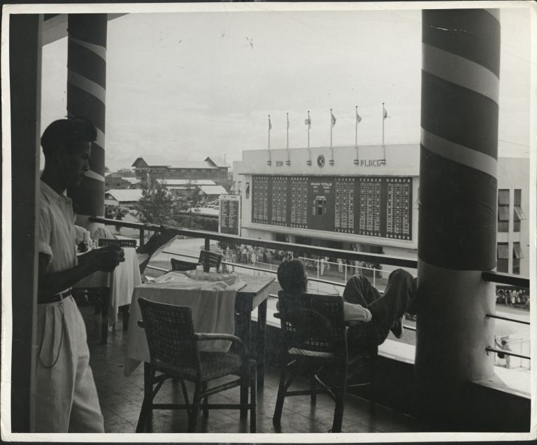 Subject: Filipino waiter serves a man in the clubhouse overlooking the track and results board of the Philippine Racing Club in Santa Ana. The racetrack has since moved to Cavite and a this venue was