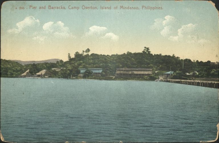 Subject: View from sea toward pier and barracks buildings of Camp Overton. Camp Overton was a U.S. Army camp near Iligan City in northern Mindanao.