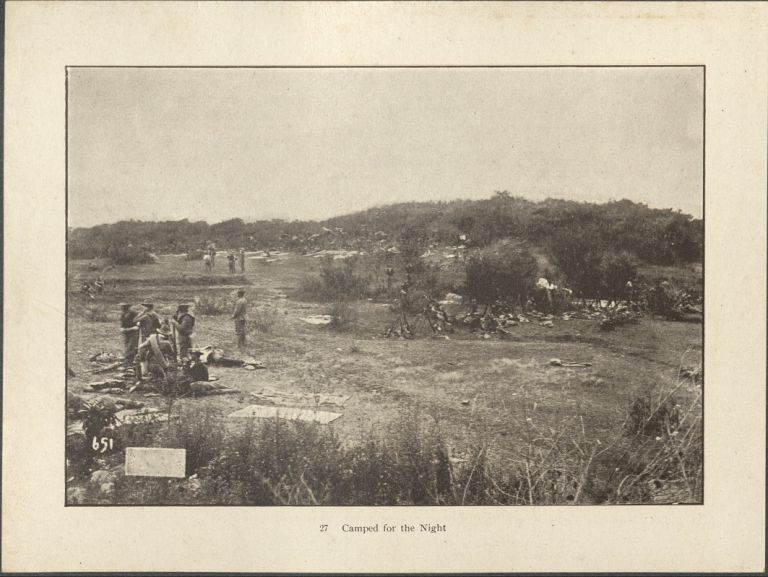 Subject: U.S. soldiers prepare to pitch their tents in a scrubby field in the Philippines. Givens was the post photographer at the Presidio of San Francisco starting in 1