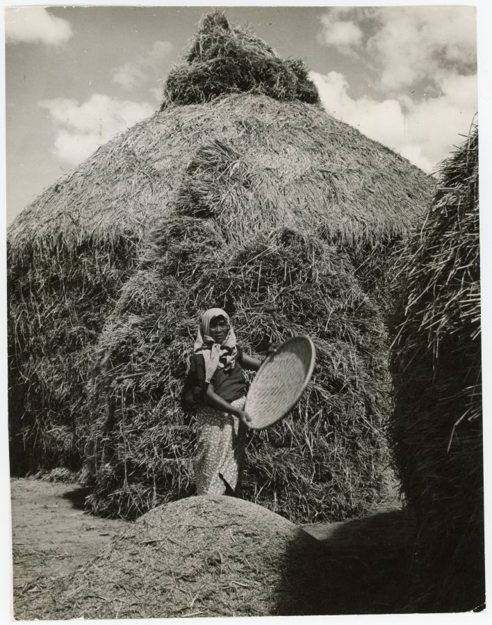 Woman winnows rice using a traditional flat basket near large stacks of cut rice stalks drying in the sun.
