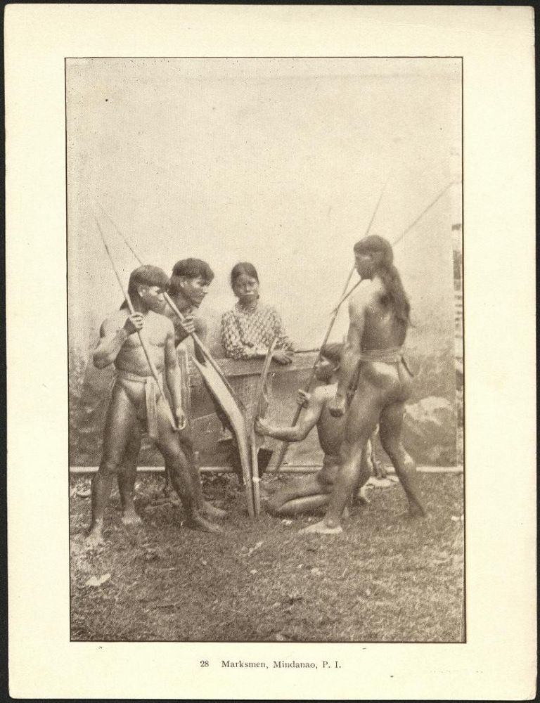 Subject: Posed shot of four Igorot men menacing each other with spears while a woman stands between them. Note: OFI-002667, same image, refers to these men as Igorot. Givens was the post p