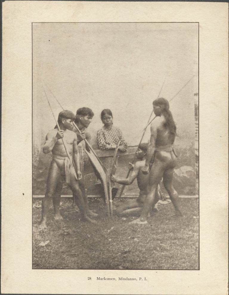 Subject: Posed shot of four Igorot men menacing each other with spears while a woman stands between them. Note: OFI-002667, same image, refers to these men as Igorot. Give