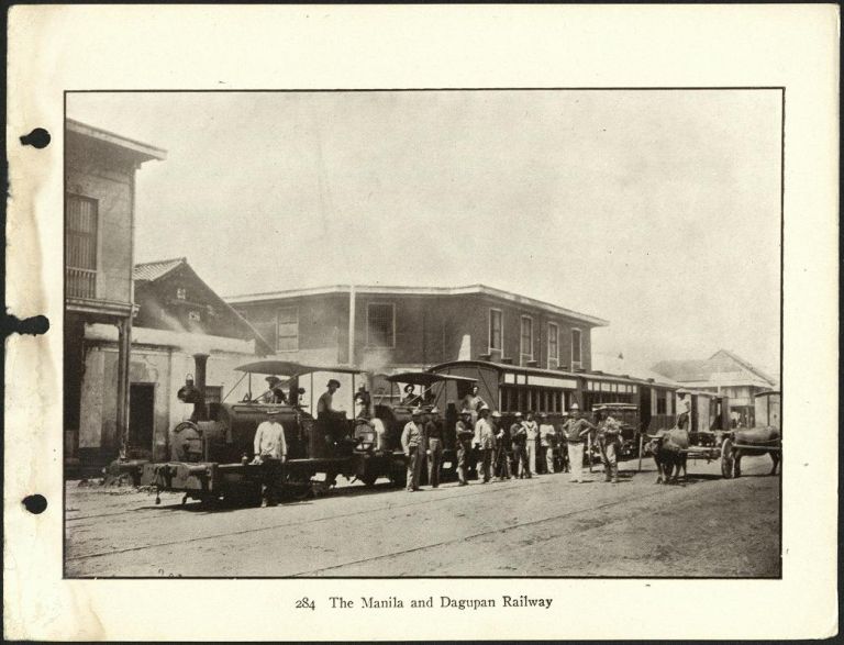Subject: Passengers pose around a steam locomotive and passenger rail cars at a train station in a town along the Manila-Dagupan line. Givens was the post photographer at the Presidio of S