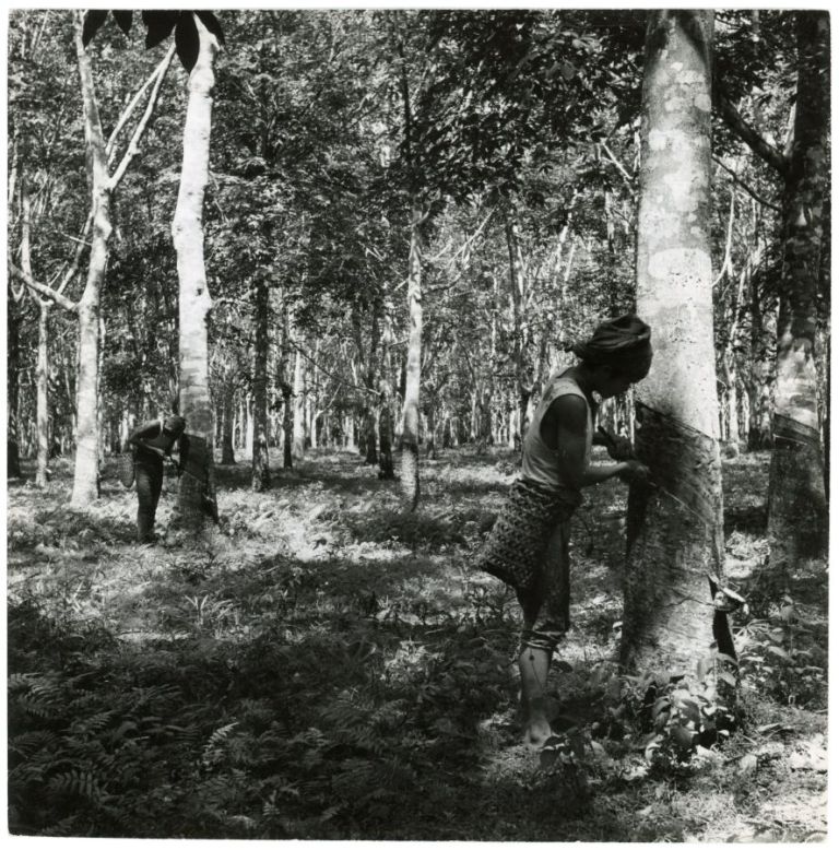 29. PHILIPPINES, Basilan Island: Tapping rubber trees. E 1214.