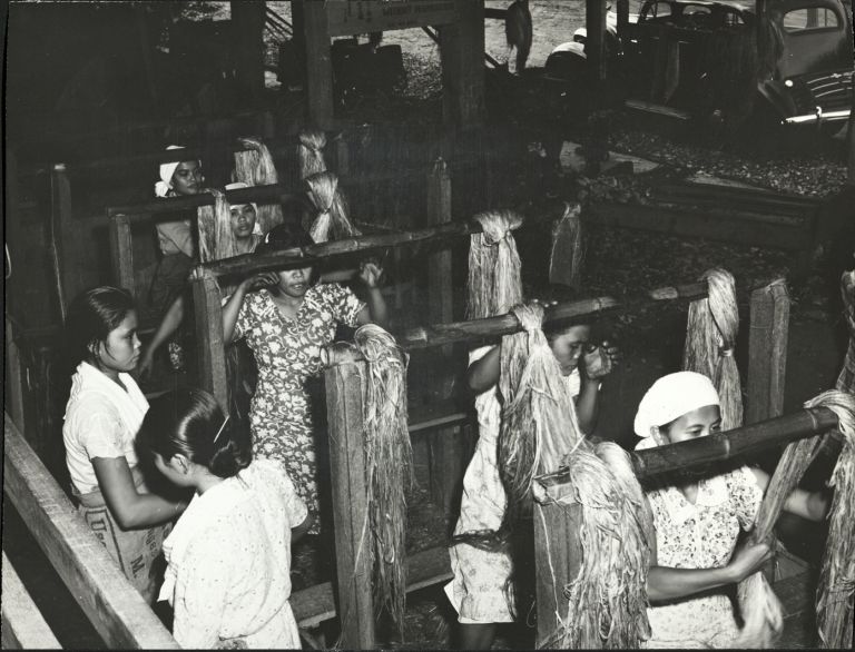 Subject: Filipino women working with knotted strings of abaca fiber on poles, likely in preparation for the drying process.