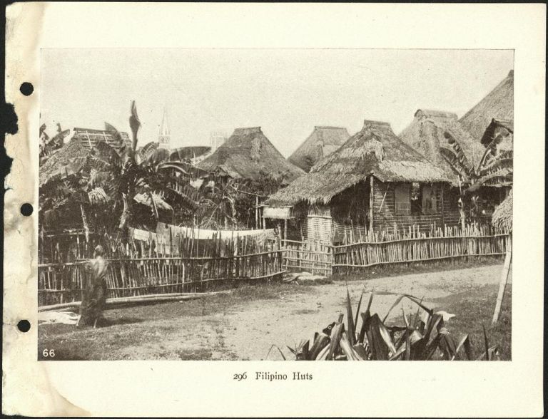 Subject: A tidy Philippine village along a road with nipa huts and fenced yards. Givens was the post photographer at the Presidio of San Francisco starting in 1899. In 1900 he traveled to