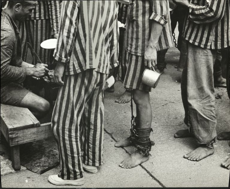 Subject: Prisoners line up for their meal in striped uniforms, some with leg irons or chains for restraints. San Ramon Prison and Penal Farm was established in southern Zamboanga in 1870. Under the Am