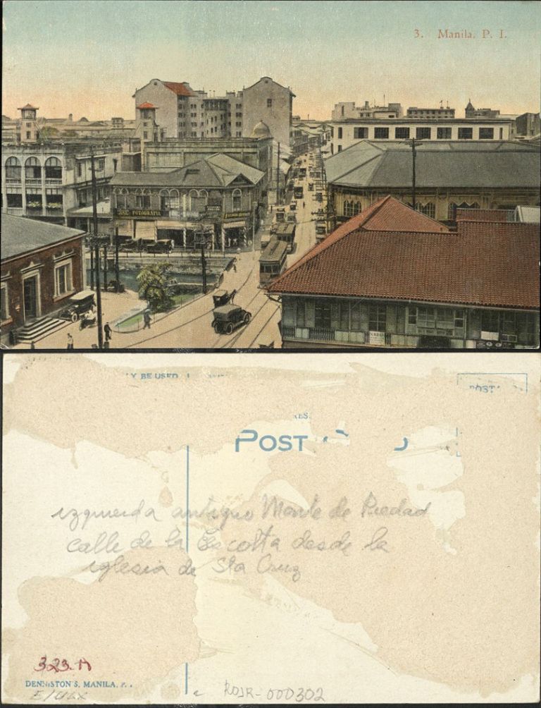 Subject: Escolta Street view from Santa Cruz church with buildings, streetcars and 1920s automobiles.