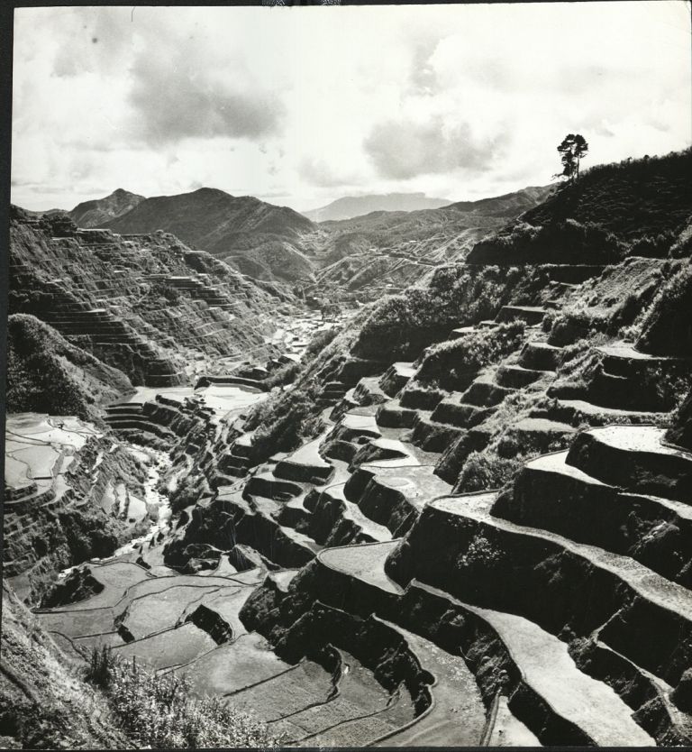 Subject: Famous Philippine rice terraces carved into mountainsides hundreds of years ago. Full caption continues: "The walls of the rice terraces the Ifugaos cut into their hillsides are from 4 to 8 f