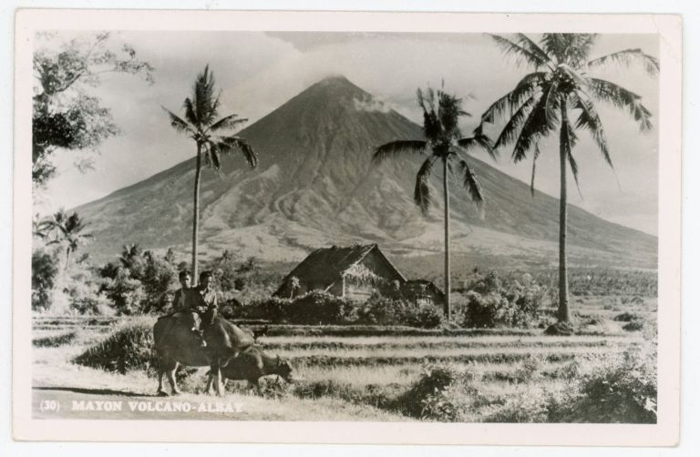 Mt. Mayon towers over rice farm on the nearby lowlands; two young men ride carabao on roadside.
