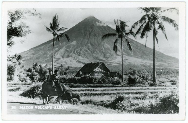 Mt. Mayon towers over rice farm on the nearby lowlands; two young men ride carabao on roadside.