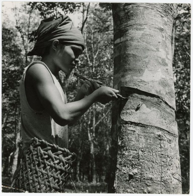 30. PHILIPPINES, Basilan Island: Tapping rubber trees. E 1214.