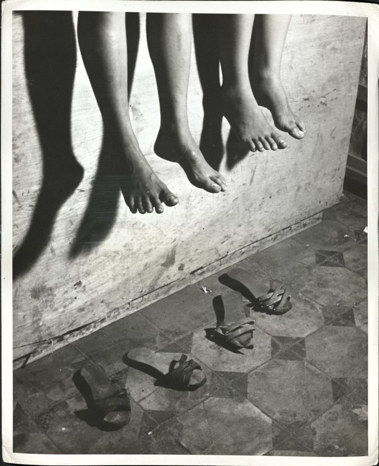 Subject: Two Filipino children sit and dangle their legs on (possibly) a wooden crate, with their sandals on the floor below them.