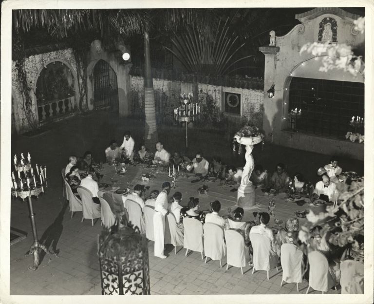 Subject: Waiters serve distinguished guests at a formal dinner at night, outdoors in a courtyard of Malacanan Palace in Manila.