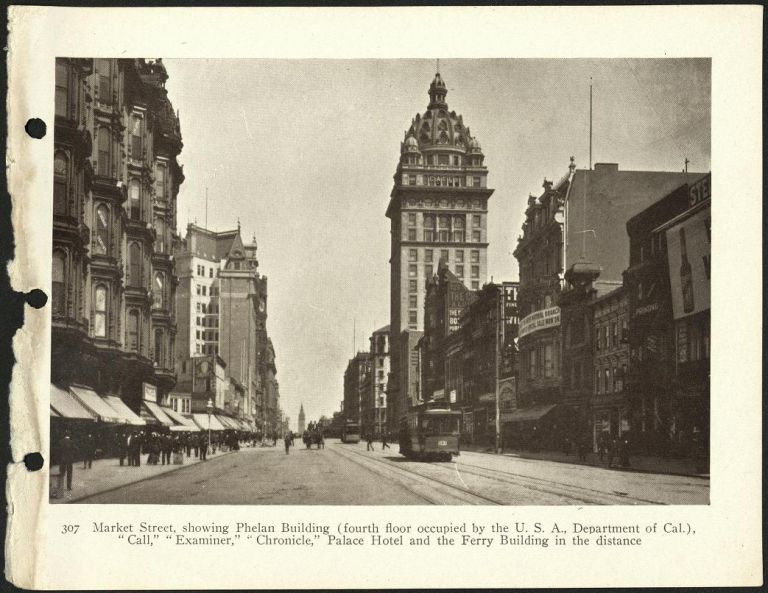 307. Market Street, showing Phelan Building (fourth floor occupied by the U.S.A., Department of Cal.) "Call," "Examiner," "Chronicle," Palace Hotel and the Ferry Building in the distance.
