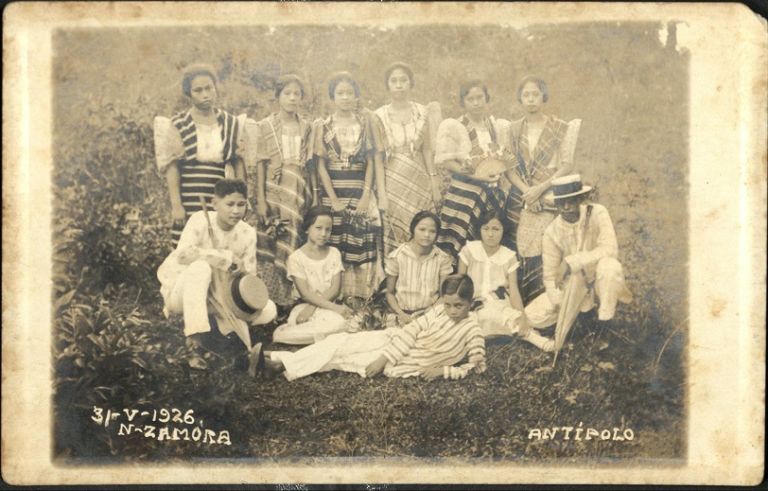 Subject: Group of 12 unidentified Filipinos, mostly women (students?) pose standing and sitting outdoors in traditional dress in Antipolo..