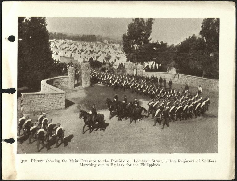 310. Picture showing the main entrance to the Presidio on Lombard Street, with a regiment of soldiers marching out to embark for the Philippines.