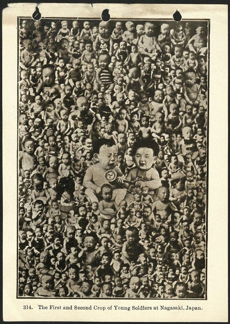Subject: A photo collage of Japanese infants. Japan adopted a more aggressive foreign policy in the late 1800s, and with victories over China in the First Sino-Japanese War and over Russia