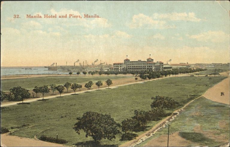 Subject: View across Burnham Green and Luneta to Manila Hotel, with piers of port area in distance.