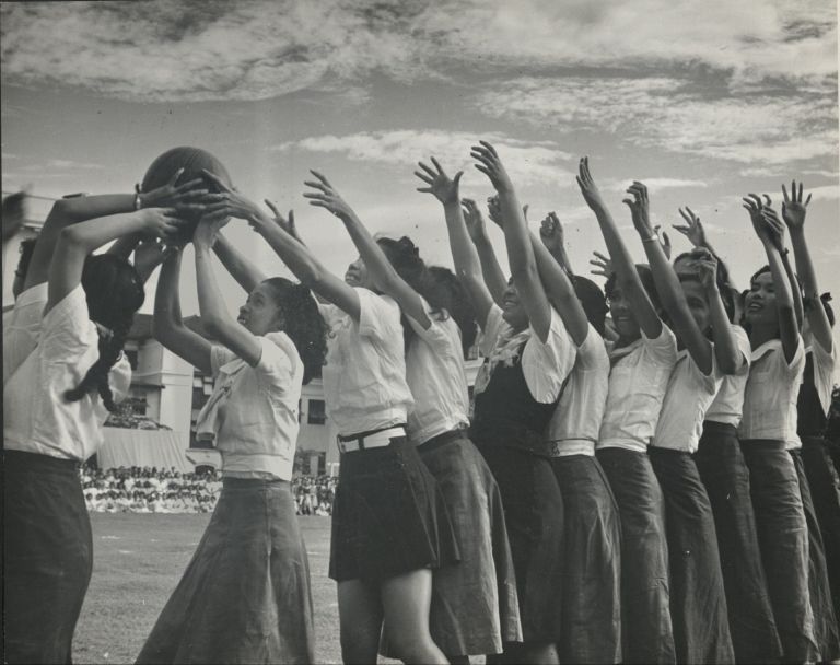 Subject: Basketball is hugely popular in the Philippines. Here a group of young women pass a ball backwards over their heads in some demonstration or competition observed by their fellow students.
