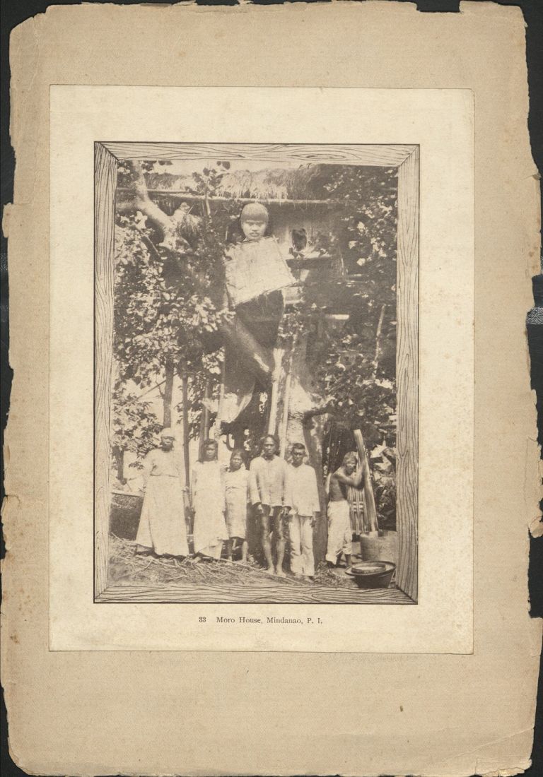 Subject: Philippine Muslim family poses in front of their house, which appears to be partially built in a large tree. The strange head at top appears to be clumsily added to the original