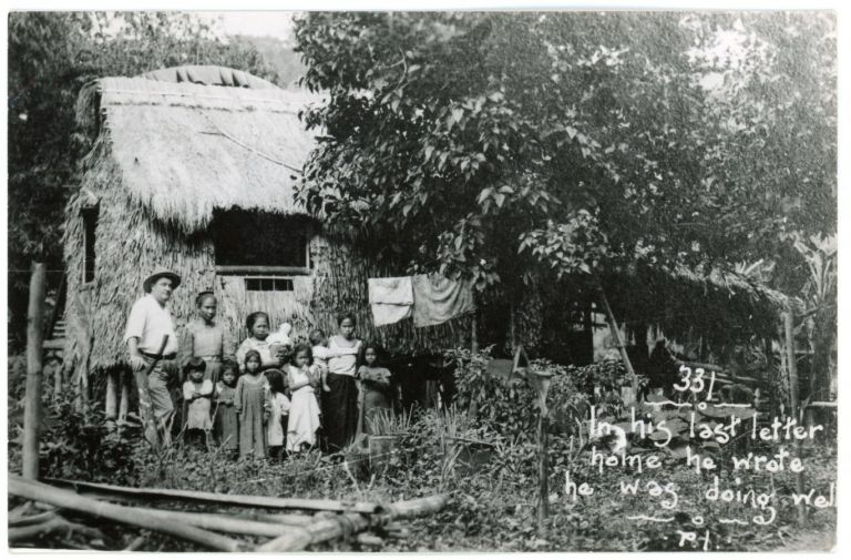American man poses with group of Filipinos - 3 women and 8 children - outside a nipa house. A humorous greeting card.