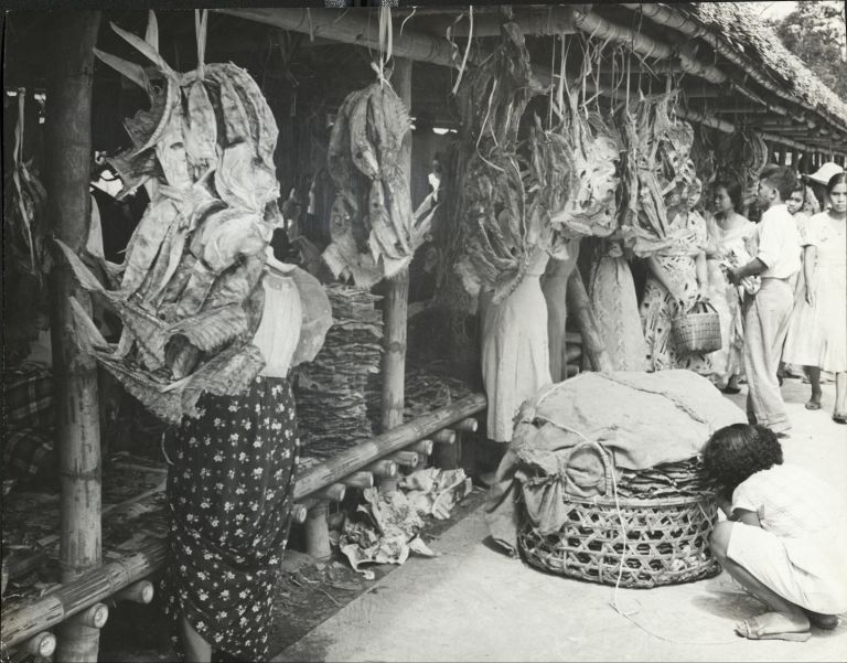 336. PHILIPPINES: Shopping for dried fish in a Baguio market. The covered basket in fore-front also contains this food.