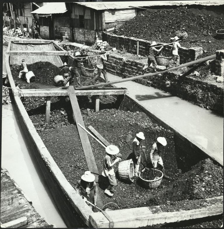 Subject: Filipinos unload coal from a casco (barge) in Cebu. Note: Same image as OFI-001187 which identifies this as coal not chromite.