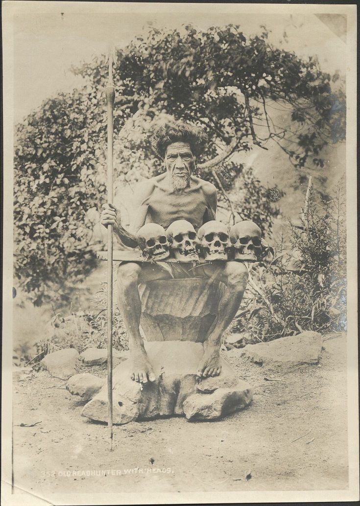 Subject: Reminiscent of the Dean C. Worcester photos of the era, an older Igorot man poses sitting on a wooden stool, holding a spear and displaying four human skulls.
