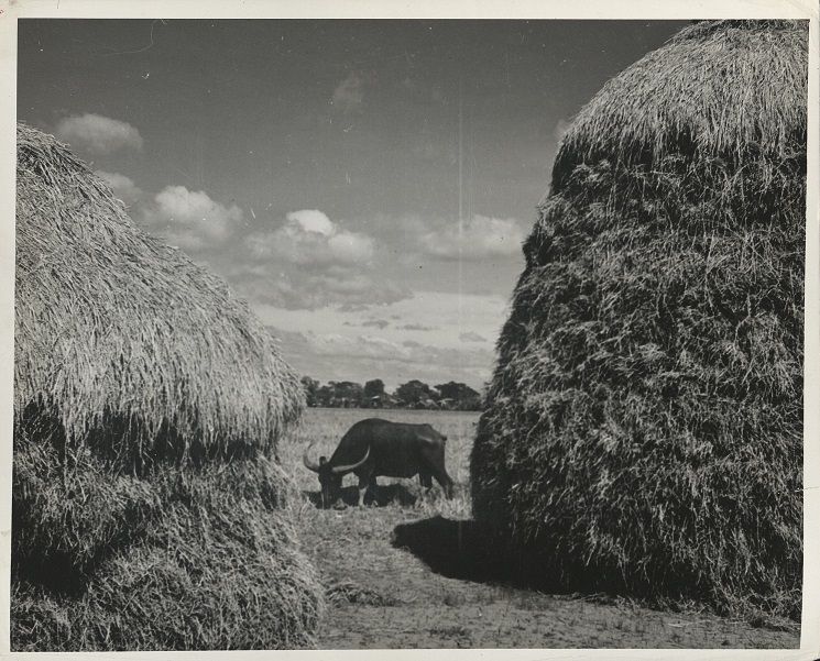 Subject: A carabao grazes in a rice field among stacks of rice stalks drying in the sun. Full caption continues: "His lack of sweat glands makes it necessary that he be allowed to rest in his water h