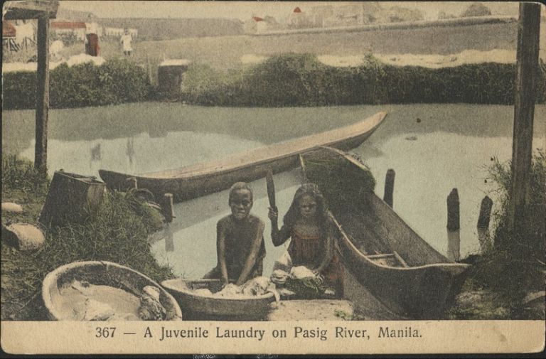 Subject: Two youths washing clothes next to dugout canoes along Pasig River or canal in Manila.