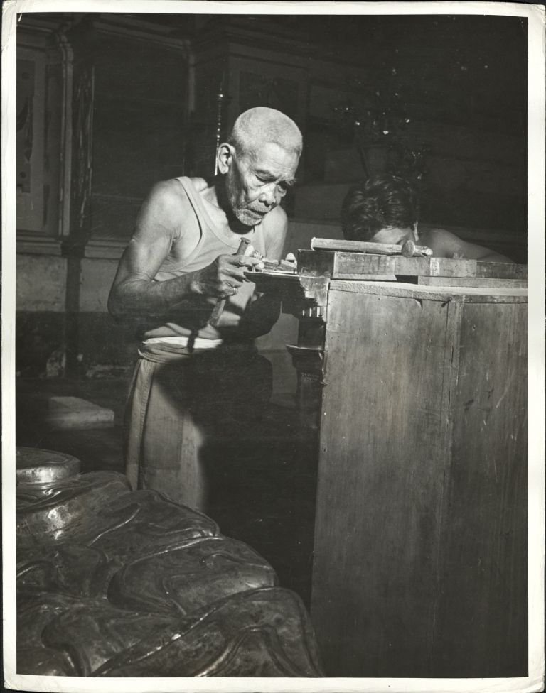 Subject: Two Filipino men - one old, one young - work on a decorative cornice moulding for a cabinet in a furniture shop or workshop. See OFI-001451 for a smaller, cropped version.