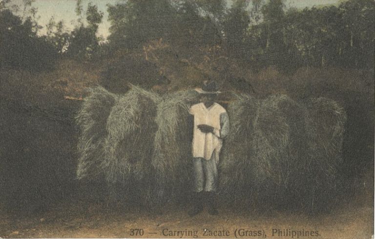 Subject: Filipino man carrying large bundles of grass for feed from shoulder pole. See also OFI-004859.