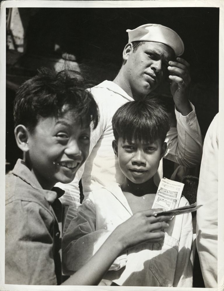 Subject: Two happy Filipino boys smile at the camera holding paper money, while an American sailor stands behind them, looking frustrated.