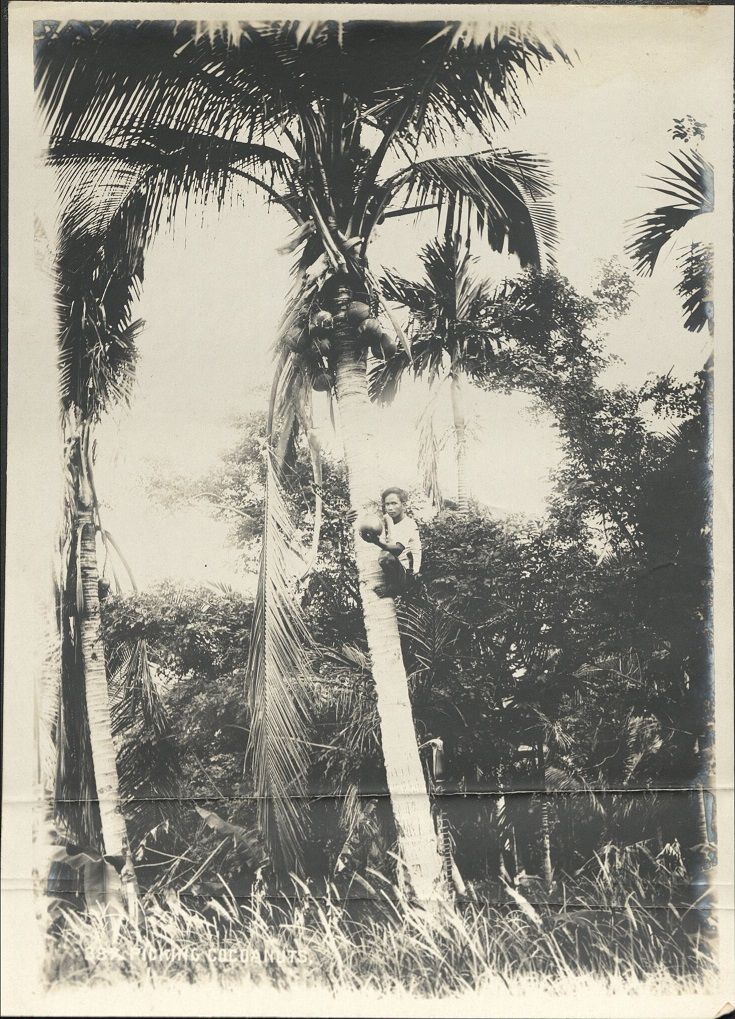 Subject: A young Filipino man climbs a coconut palm to harvest the nuts using a large knife.