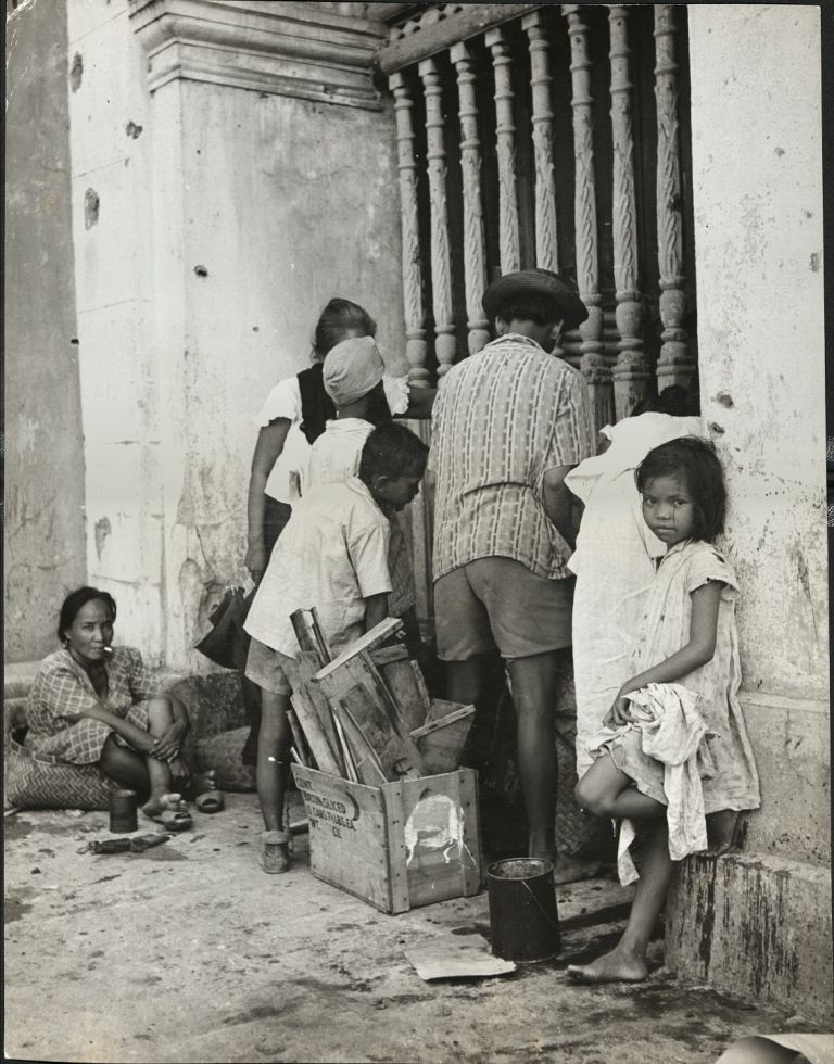 Subject: Although not looking particularly malnourished, these street kids in postwar Manila may be up to mischief. Notice the bullet holes in the building's facade, left over from the 1945 liberation