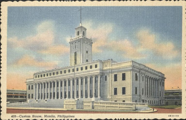 Subject: Bureau of Customs building and tower, located in the port area of Manila.